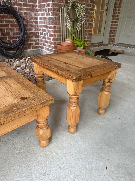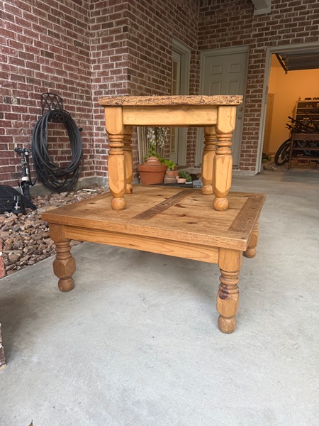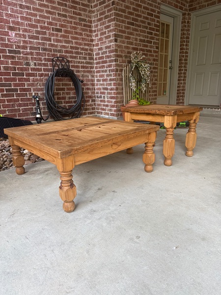 $150 for both: coffee table and side table. Turned legs, super sturdy. Great condition. Coffee table: 35.5”x35.5”x16”