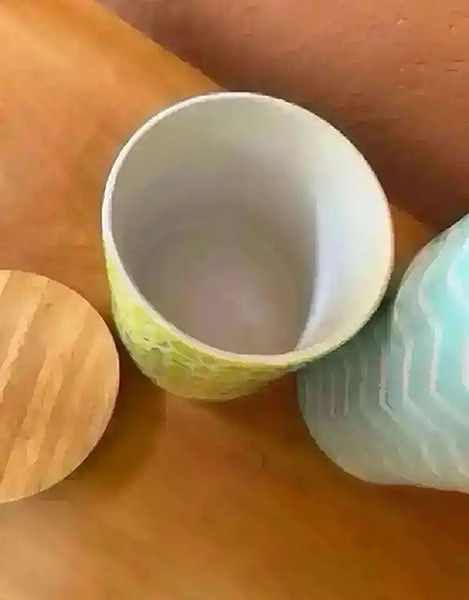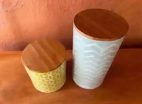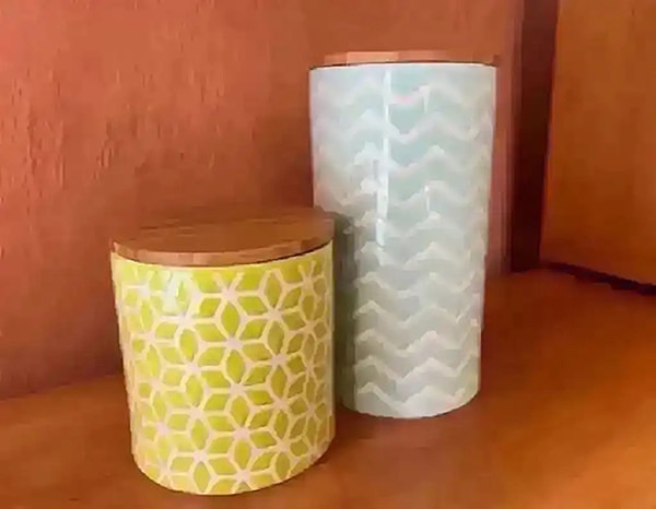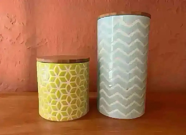 Green and blue geometric patterned ceramic canisters with bamboo lids