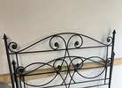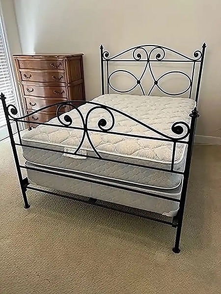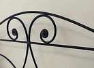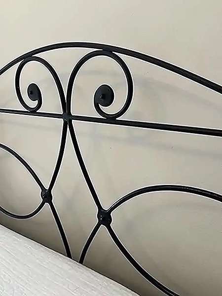 Elegant Pottery Barn black wrought iron bed with intricate design.