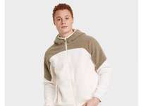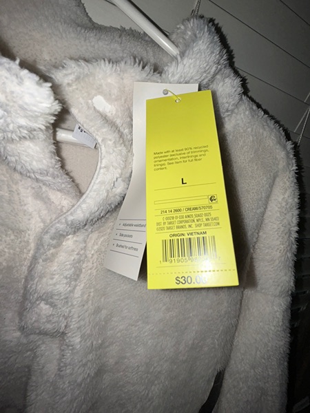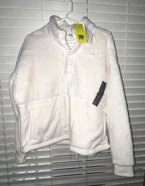 Brand is All in Motion, size large, color is cream. Has snap front, kangaroo pouch, adjustable waistband, super soft fabric, and high neckline. New with tags from smoke free home. $12