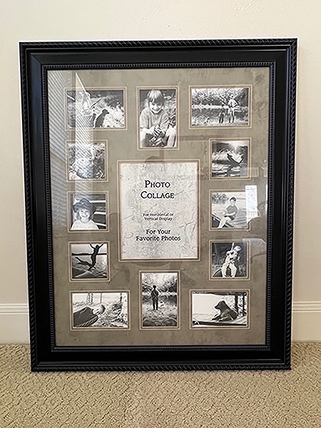 Beautifully framed glass picture collage with 13 photo slots. 22” x 28”. Like new!…$20 firm