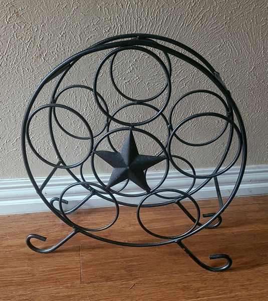 Counter top wine rack, Texas star design, dark bronze color, holds five bottles. Excellent condition. $10, Porch Pickup, located in The Woodlands, close to intersection of Woodlands Pkwy and Kuykendahl.