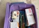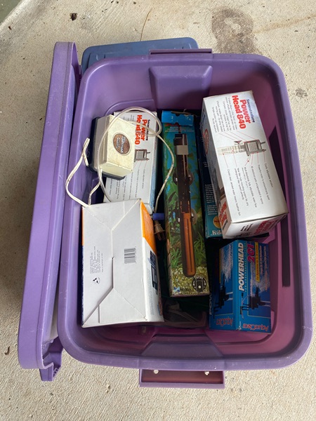 Crate of miscellaneous aquarium supplies (heaters, pumps, etc.)