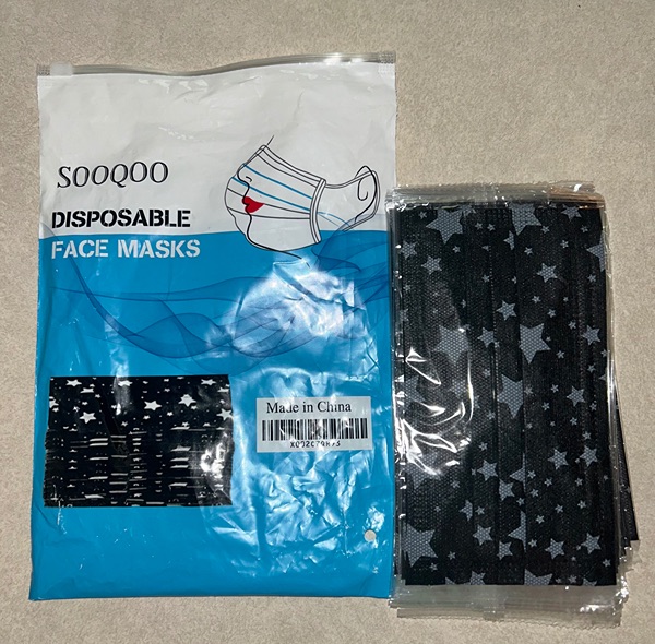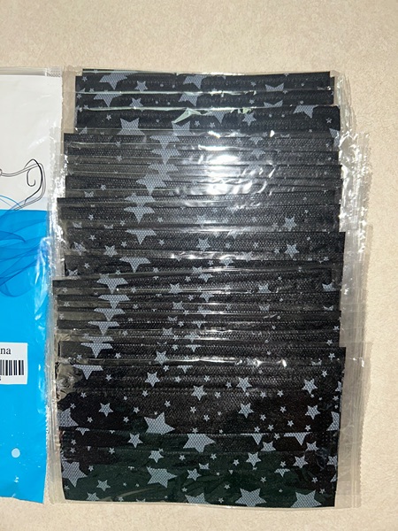 One bag of individually wrapped black with stars face masks, 21 count.