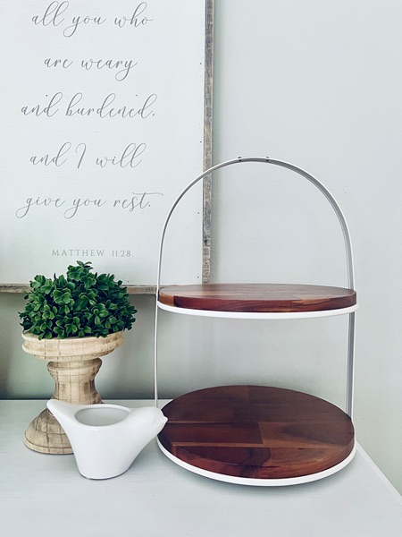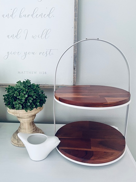 Beautiful set of decor - includes two tiered stand by Magnolia, natural wood pillar (great for candles or greenery), faux greenery, and white bird vase/candle holder. $30 for all, porch pickup in The Woodlands.