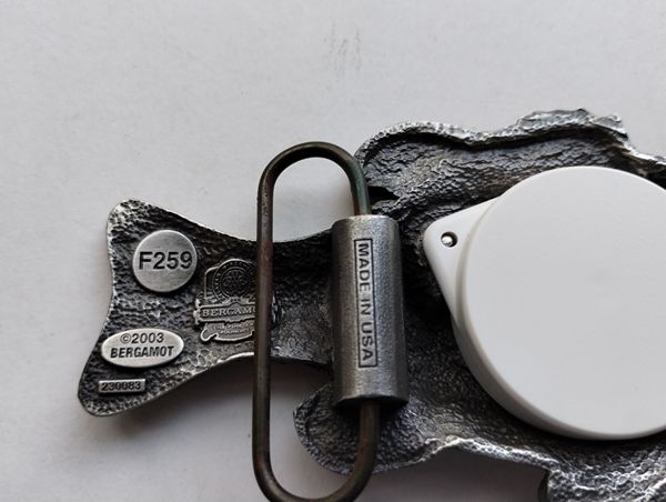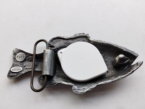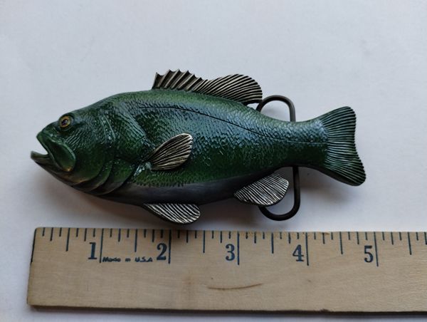 For sale is a New Large Mouth Bass Belt Buckle with a Measuring Tape on the back. Made by Bergamot in 2003. #F259. Made in the USA. Measures approximately 5 inches long and 2.5 inches tall with a maximum belt width of 1.5 inches. Very unique and different. From a smoke/pet free home in the back of The Woodlands.
