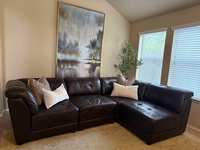 Beautiful and sturdy loveseat and chair set in great condition. Features unique vintage-style arms and solid wooden legs with rich espresso finish.