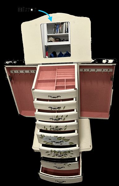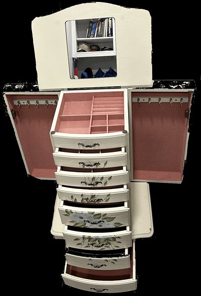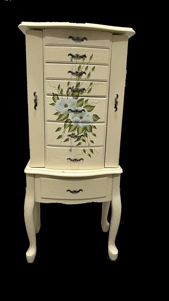 Beautiful large, hand-painted Jewelry Armoire. 12” deep, 17” wide, 40” tall (closed position) 1 large drawer, 3 medium sized drawers, 3 small drawers. 2 side doors for hanging neclases, 1 top box for rings, ear rings, etc.) We have moved and no longer have room for it. Very good condition. Conroe (FM1488 & Old Conroe Rd) Text 832-326-3119.