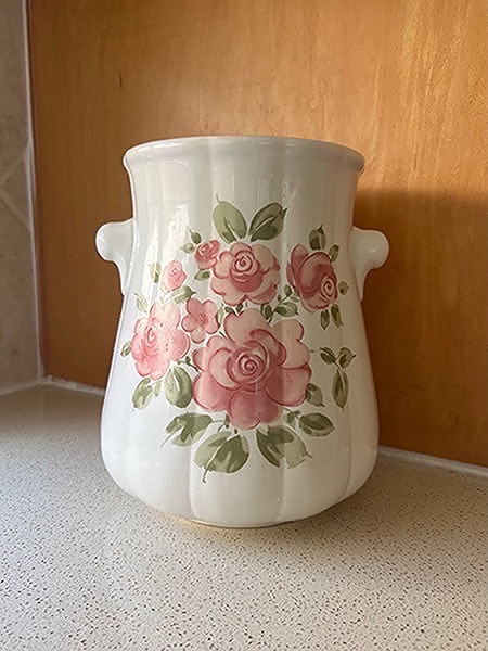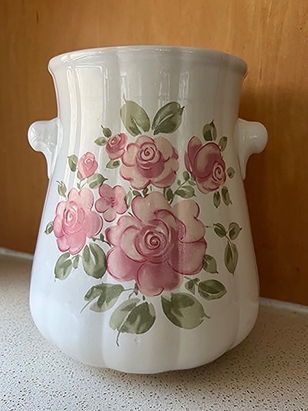 Ceramic utensil crock by Gibson. Approx. 8 1/2” tall and wide. No chips or cracks!…$12 firm