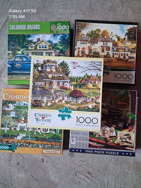 Five 1000 piece Charles Wysocki puzzles. Never assembled. New. These detailed jigsaw puzzles feature colorful, whimsical and nostalgic American folk art scenes with clean lines, bright colors and rich, detailed scenes. They depict charming small towns, coastal landscapes and rural life. Feature distinct, intricate imagery and are regarded as relaxing yet engaging to assemble.