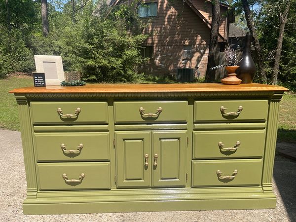 Vintage solid wood American Drew Cherry Grove Traditional style 9 drawer dresser. Oregano Spice semi-gloss finish. Original hardware. Wallpaper lined drawer bottoms.