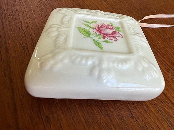 • It features a white, square-shaped ceramic frame with an embossed floral design.