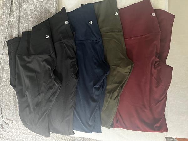 5 pair of Lululemon leggings size 8, length 28". All pairs have been taken care really well, hang dry and delicate cycles. 2 pair of black, one navy blue, one sage green and burgundy.