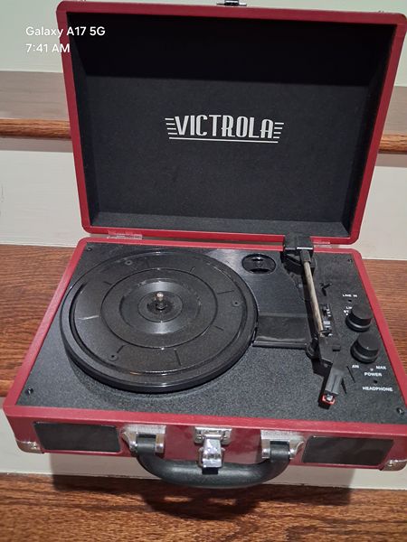 This has ever been used. It has been stored on a shelf in my closet. Victrola Bluetooth suitcase record player with 3-speed turntable. Relocating and must sell this great item asap.