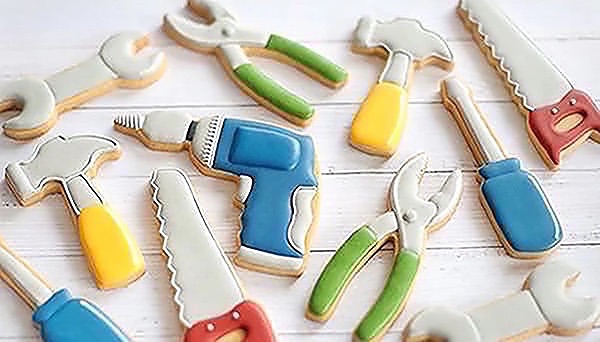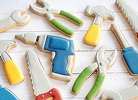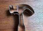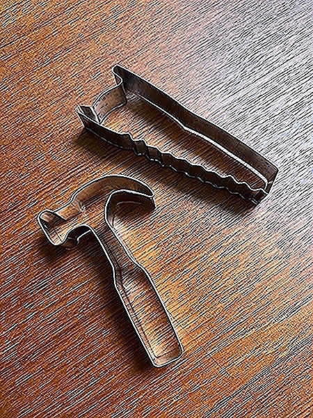 Set of stainless steel cookie cutters (hammer & saw) shaped like tools from Sur La Table. Approx. 5" each…$5 total, firm