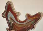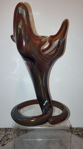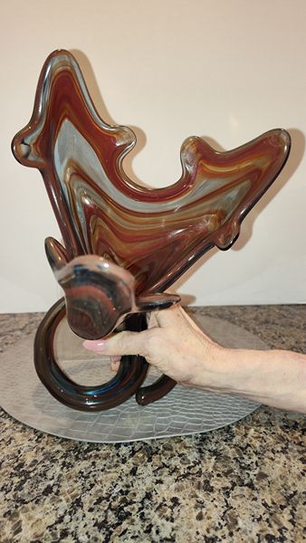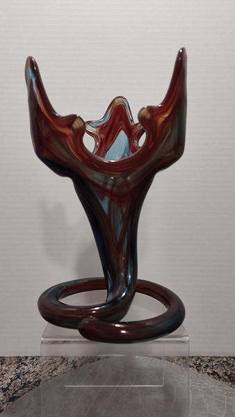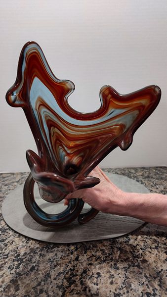 Hand blown art glass with spiral coil pedestal base. A unique piece from the mid 20th century. This style was made by artisan especially in regions like Murano, Italy and Czechoslovakia. The technique involved layering different colored glass and manipulating it while molten. Each piece is one of a kind.
