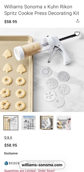 Quickly create spritz cookies or savory canapés in charming shapes for the holidays and beyond. Just fill the barrel of our press with dough and insert one of the discs. (Similar item shown in last pic.)…$25 firm