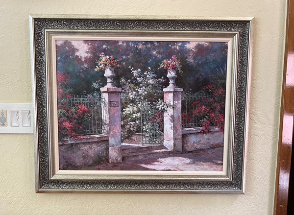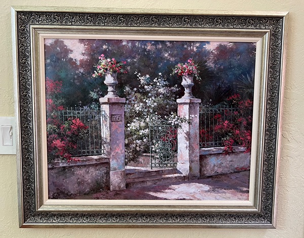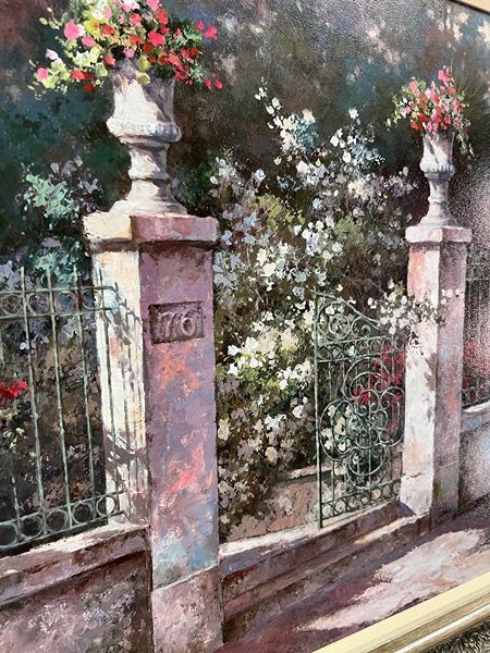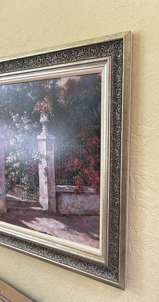 Large elegant framed painting of a garden scene with ornate border. Approx. 34” x 28”…$30 firm