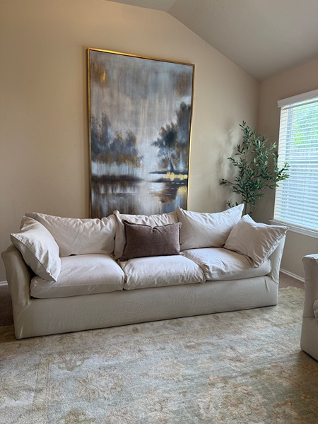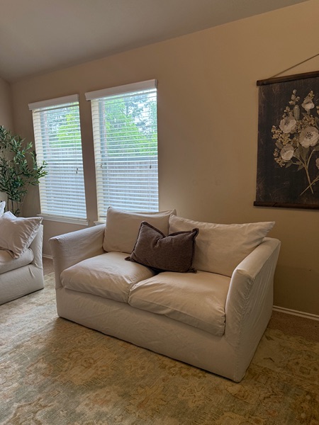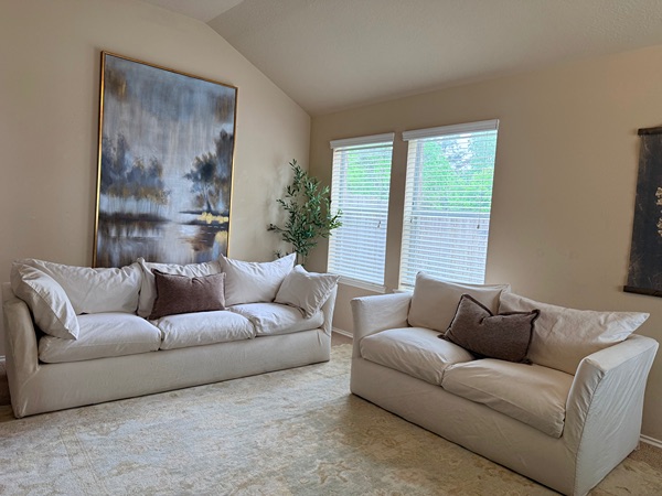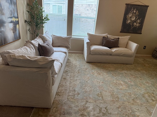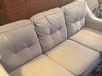 This couch set is SO comfortable. Cushions are plushed and soft. Everything is fully washable (base & cushion covers). Performance fabric. The base part Velcros onto the base. Beautiful cream color that will go perfectly in your livingroom.