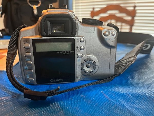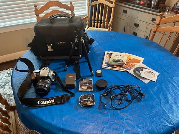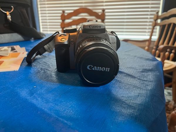 Canon Rebel Camera. Older model in exellent condition, well cared for and gentley used. Works great. Comes with two rechargble batteries with charger. Lens case and uv protection lens. All original paperwork and instructions. Large mulit-compartment carrying case. Includes a tripod and remote.