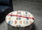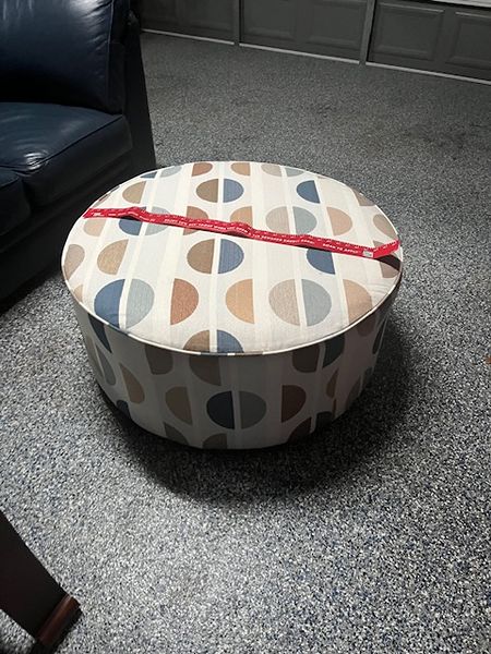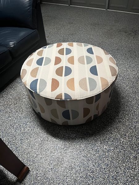 36 " round ottoman. New floor model. Upholstered in cream, blues, and beige.