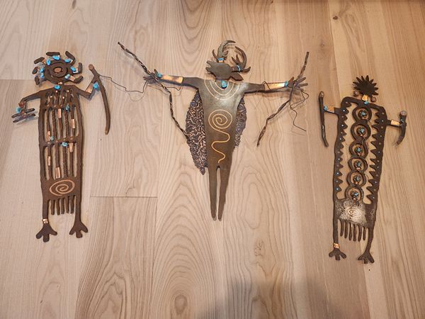 Three petroglyph inspired metal art decor with attached turquoise stones each 22 inches in length.$125 for all 3