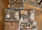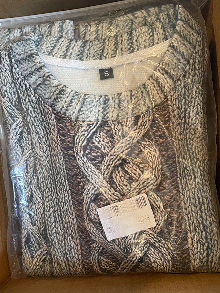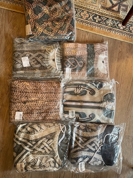 Total of 7 sweatshirts with Celtic knit patterns printed on them. Most are pullovers, one zips up, one buttons, several have hoods.