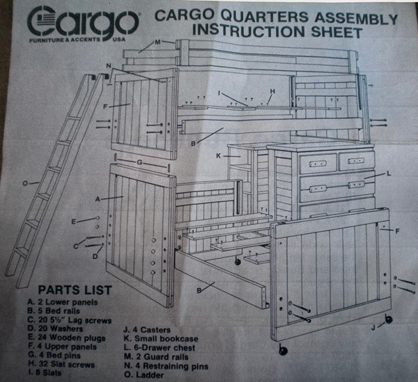 Cargo kids bunk beds. Includes 3 twin size mattresses. Includes bed side tables but not the dresser. Currently sitting in garage ready to be picked up. All hardware included. Some joints may need some glue. Sorry, no pictures of assembed bed, but here's a diagram of the assembly from the instruction sheet. Very easy to assemble.