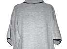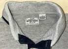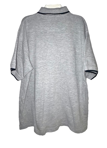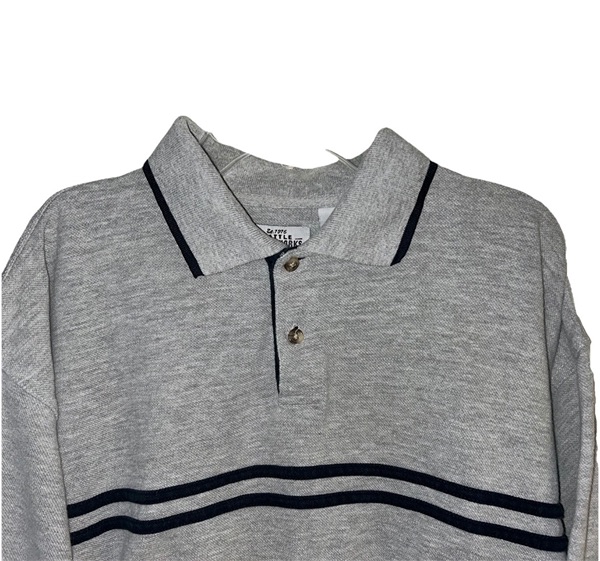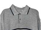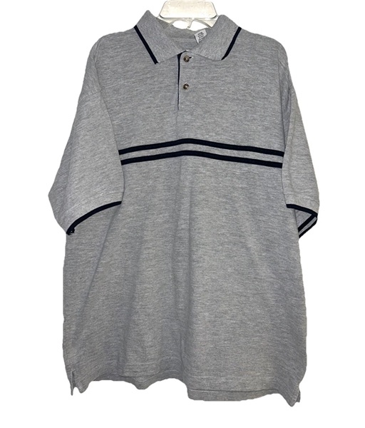 Men’s size medium short sleeve gray polo from late 90s/early 2000s. Featuring 2 button closure with wood toned buttons, double navy horizontal chest stripe, navy trim on collar and sleeves, split hems, and rib-cuffed sleeves. 90% cotton, 10% polyester. Very good condition from smoke free home. $10