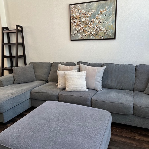 Like new Ashley sectional. No rips or stains. 12ft wide . 2 book cases , wall art and flat TV. Everything in a bundle. TV works and is 32-42 inches. Non smoker house . Non Pet house .