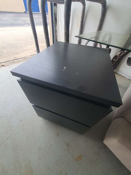 Sleek black nightstand with two handleless drawers — clean, modern look that fits any bedroom style. Compact size makes it perfect next to a bed without taking up too much space.