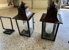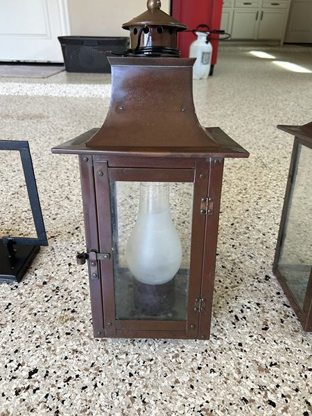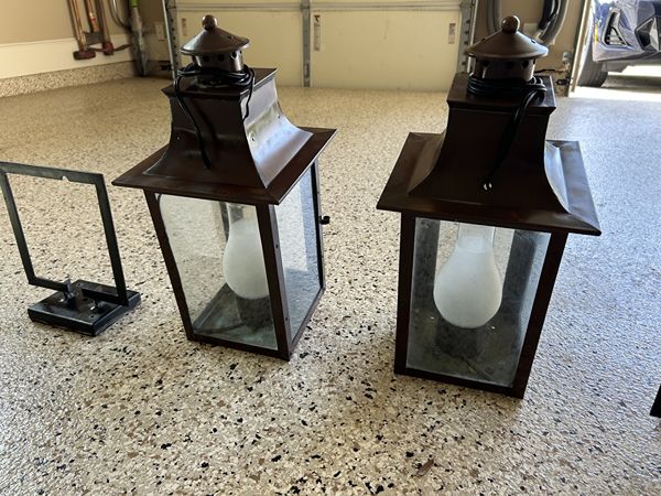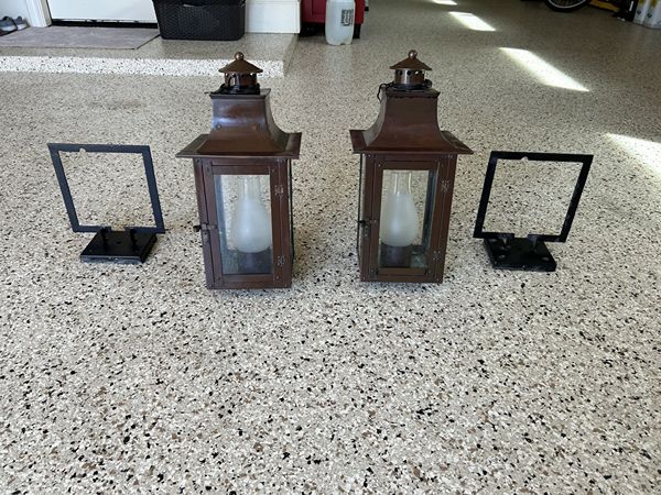 Pure Copper, high quality electric lights for a porch or patio. 21" x 10" x 10" with wall brackets. Made in New Orleans and cost $700 each. Perfect condition.