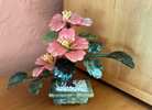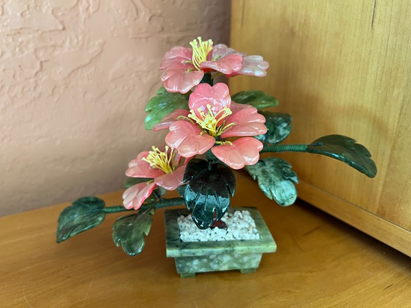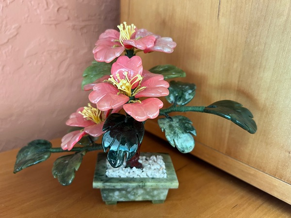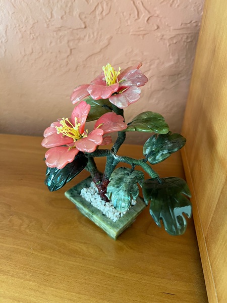 This item is a vintage Chinese carved jade flower tree bonsai, featuring hand-carved leaves and a base made from green jade, with blossoms fashioned from other stones like rose quartz. ®