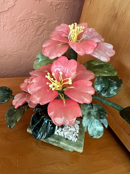 • Material: Carved jade stones for leaves/base, rose quartz for flowers, and flexible wire branches.