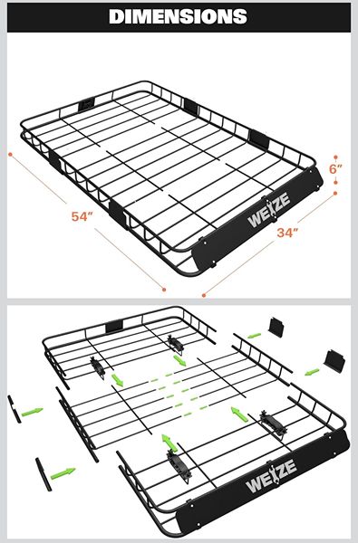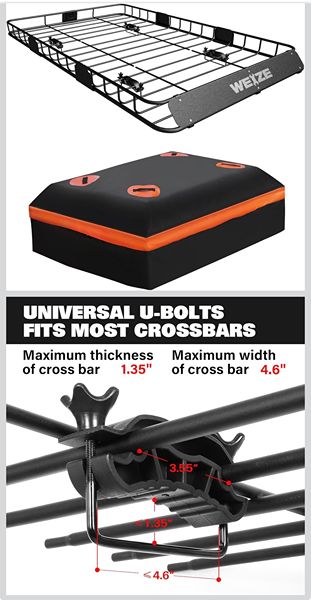 The WEIZE roof rack basket measures 54" x 34" x 6". It fits crossbars with a maximum thickness of 1.35" and a maximum width of 4.6"