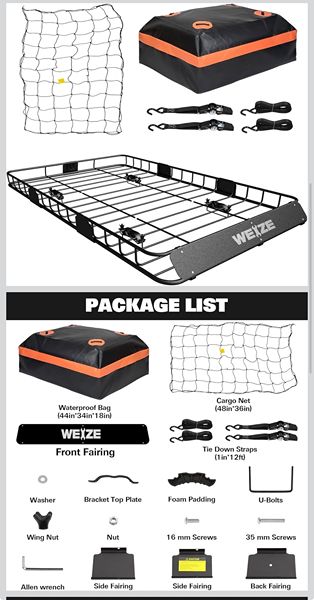 USEFUL ACCESSORIES: This roof cargo basket comes with 2 heavy-duty 12ft tie-down straps (2200lbs), 1 cargo net (36"x48"), and 1 cargo bag for secure transport of luggage, tents, storage boxes, and more.