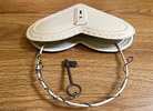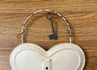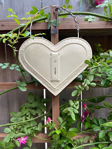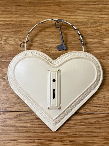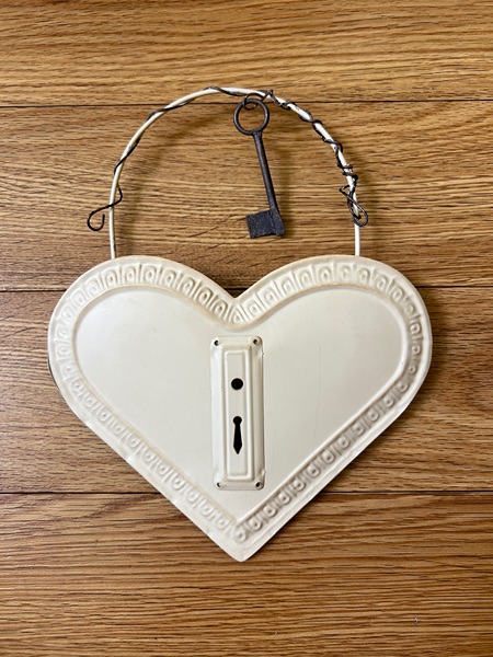 Metal Heart with Key tin Basket, often utilized as a hanging wall pocket for seasonal decor. ®