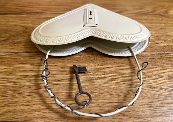 • Design: A heart-shaped wall basket featuring a decorative keyhole on the front and an accompanying skeleton key hanging from a wire handle. •