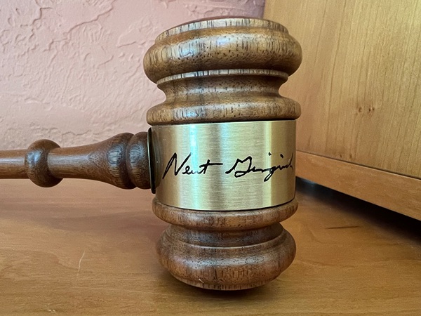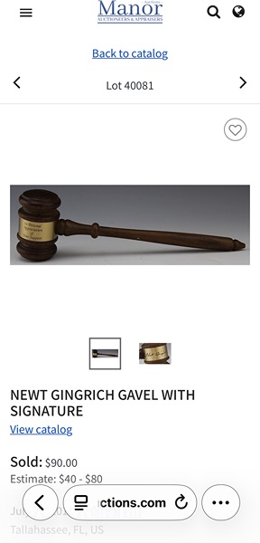 NEWT GINGRICH GAVEL WITH SIGNATURE Collectable gavel, features plaque reading "In Personal Appreciation of Your Support." Signed Newt Gingrich. Size: 10"...$30 firm