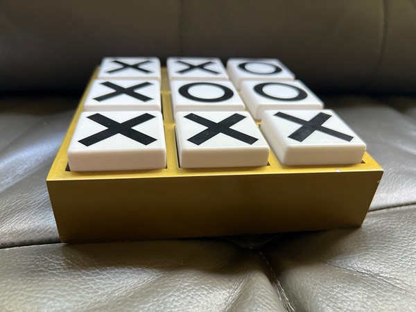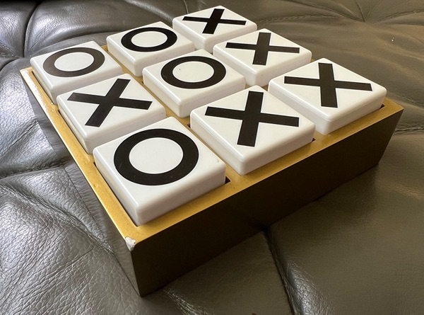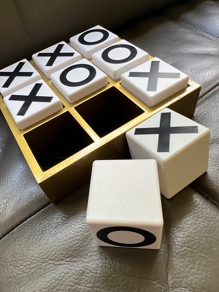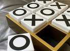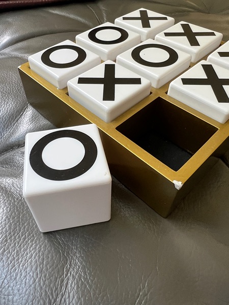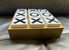 Classic game iin gold wooden box (a few scuffs to the gold paint) and plastic play pieces which contain both x and o on each cube. Approx. 5 1/2" x 5 1/2" ...$5 firm
