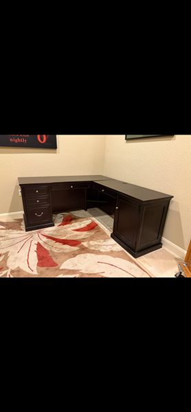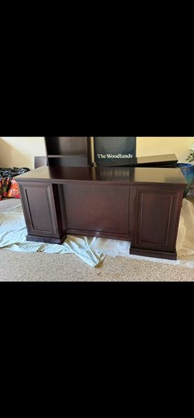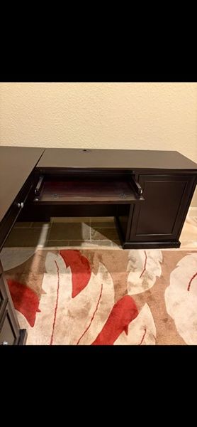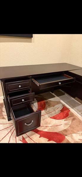 Return has a “pencil” drawer and 3 drawers, including a file drawer. Originally purchased from Gallery Furniture for $1200. Selling matching bookshelf, as well, in a separate listing for $175.