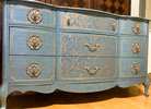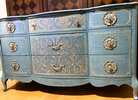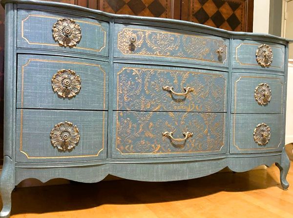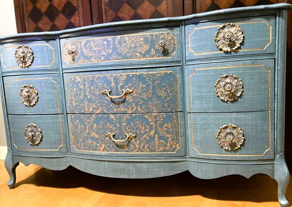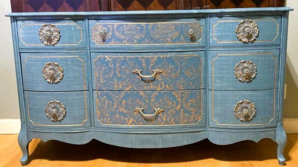 - We cleaned, filled, sanded, primed, added worn linen texture paint and glazed in layers. We hand poured molds for backplates on the outer drawers and found some really pretty vintage handles for the front bottom drawers. Then we added raised stencil designn on the front and guilded it and used the same stencil for the sides unguilded, then sealed for durability.