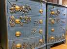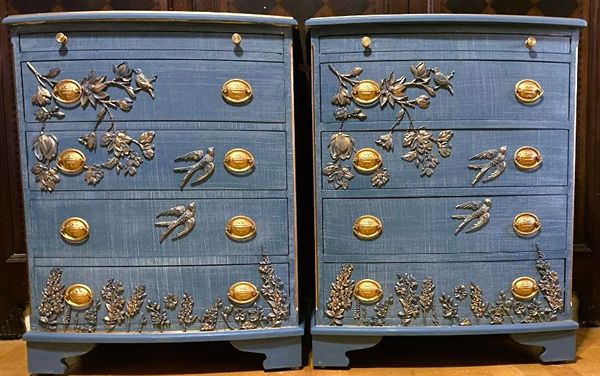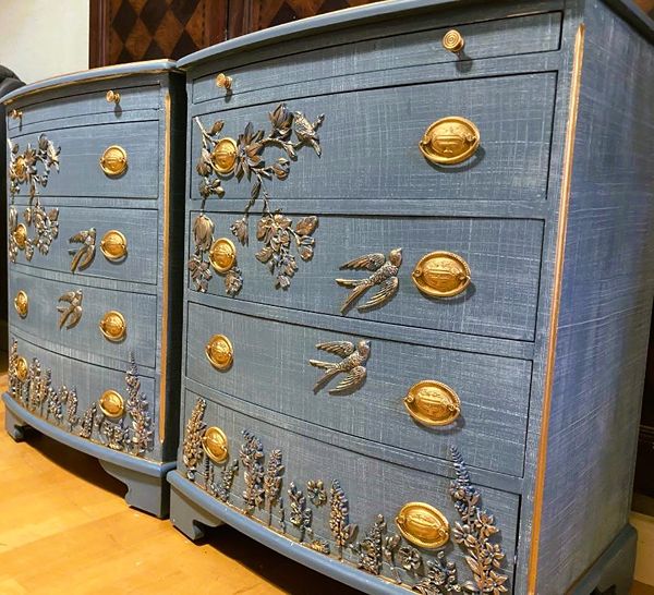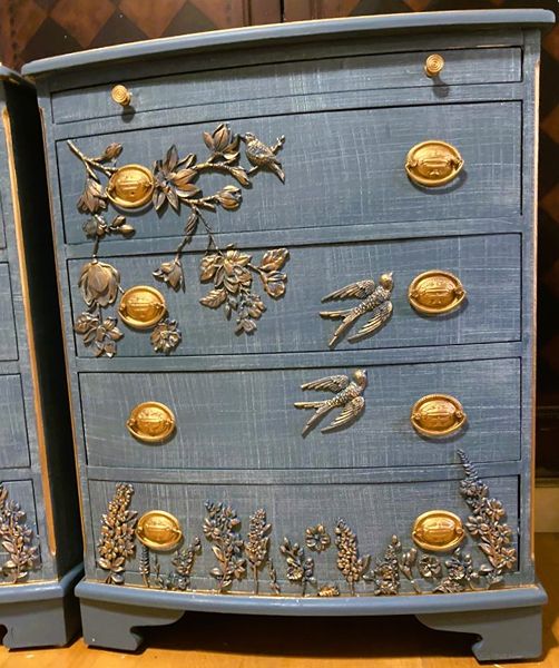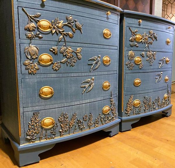- We cleaned, filled, sanded, primed, added worn linen texture paint and glazed in layers, hand poured and applied moulds of birds, branches and florals. Then, gilded and sealed for durability.