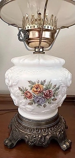 • Structure: Comprised of milk glass with brass or metal accents and a glass chimney. •