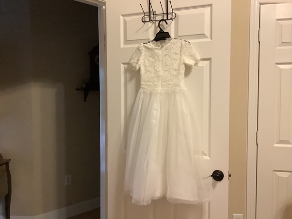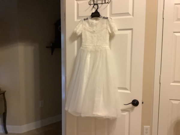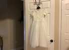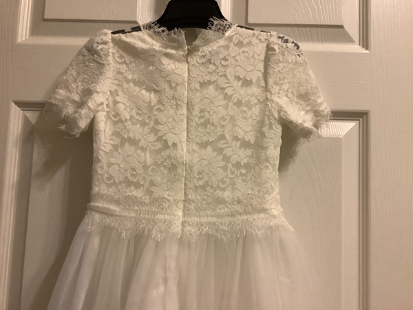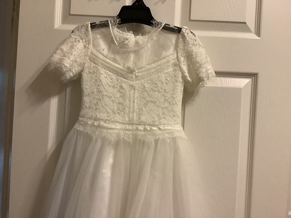 Trish Scully Designs: Beautiful lace and tulle dress. Size 7. Worn once for a flower girl at a wedding. Color is an off-white or light cream. Length from back neck to hem is 36".
