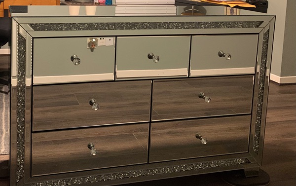 BEAUTIFUL MIRRORED DRESSER, 7 Drawers, Like New. Manufactured in 2021 and comes from a smoke feee home. Dimensions approximately 471/4" W x 16" D x 32" H. Cash only. Buyer pick up.