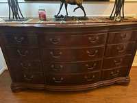 Hexagon shape. Black slate top with raised scroll pattern. Dual doors. Brass pulls. Storage underneath. 23 inches tall and 26 inches wide. Asking $30.00.