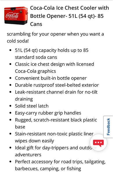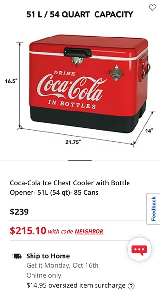 Brand new, never used. Graphics vary slightly from stock photo, but features, dimensions, capacity, etc. are all the same. Fill it with Coca Cola merch to make a great gift. Smoke free home. $100