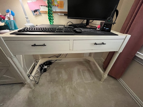 Farmhouse desk in cute antique white coloring. Desk is in great condition and would be perfect for any bedroom. Desk originally purchased on Wayfair in 2023 for $200 and used in home office. The desk has 2 drawers and easily fits a rolling computer chair. Dimensions: 29 inches tall, 22 inches deep and 42 inches wide.