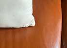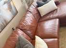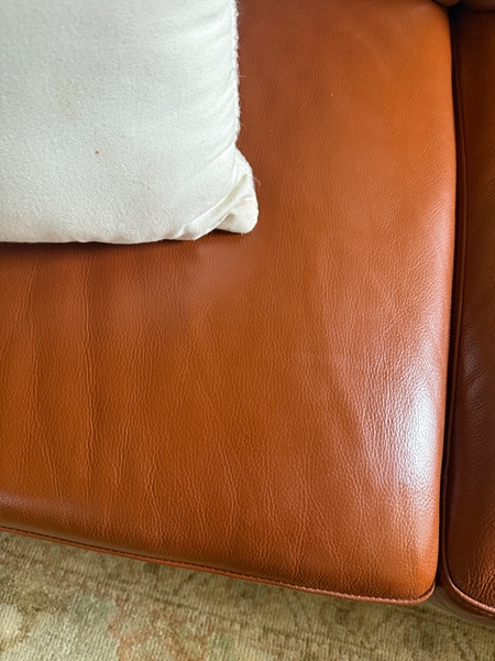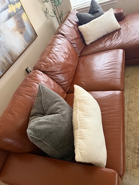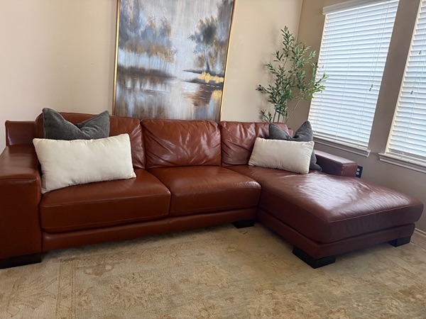 Beautiful Saddle Color! It’s in great condition. Very minimal wear. A slight tear on the chaise part (it was previously bonded) doesn’t affect the couch. Sits comfortably. No stains or rips.